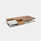 Nesta proposta a ideia foi resgatar o espírito purista da arquitetura Bauhaus. Uma busca por formas e linhas simplificadas e definidas principalmente pela função do objeto. Matiz representa esse pensamento. Mesa de centro com estrutura em aço de secção mínima suporta planos horizontais ora em Madeira, ora em metal ou mármore. Nichos proporcionam a variação no uso e a mescla equilibrada de matéria confere elegância a peça. **O conjunto acompanha 2 mesas de centro matriz, modulo 1 e 2.**