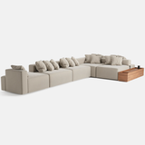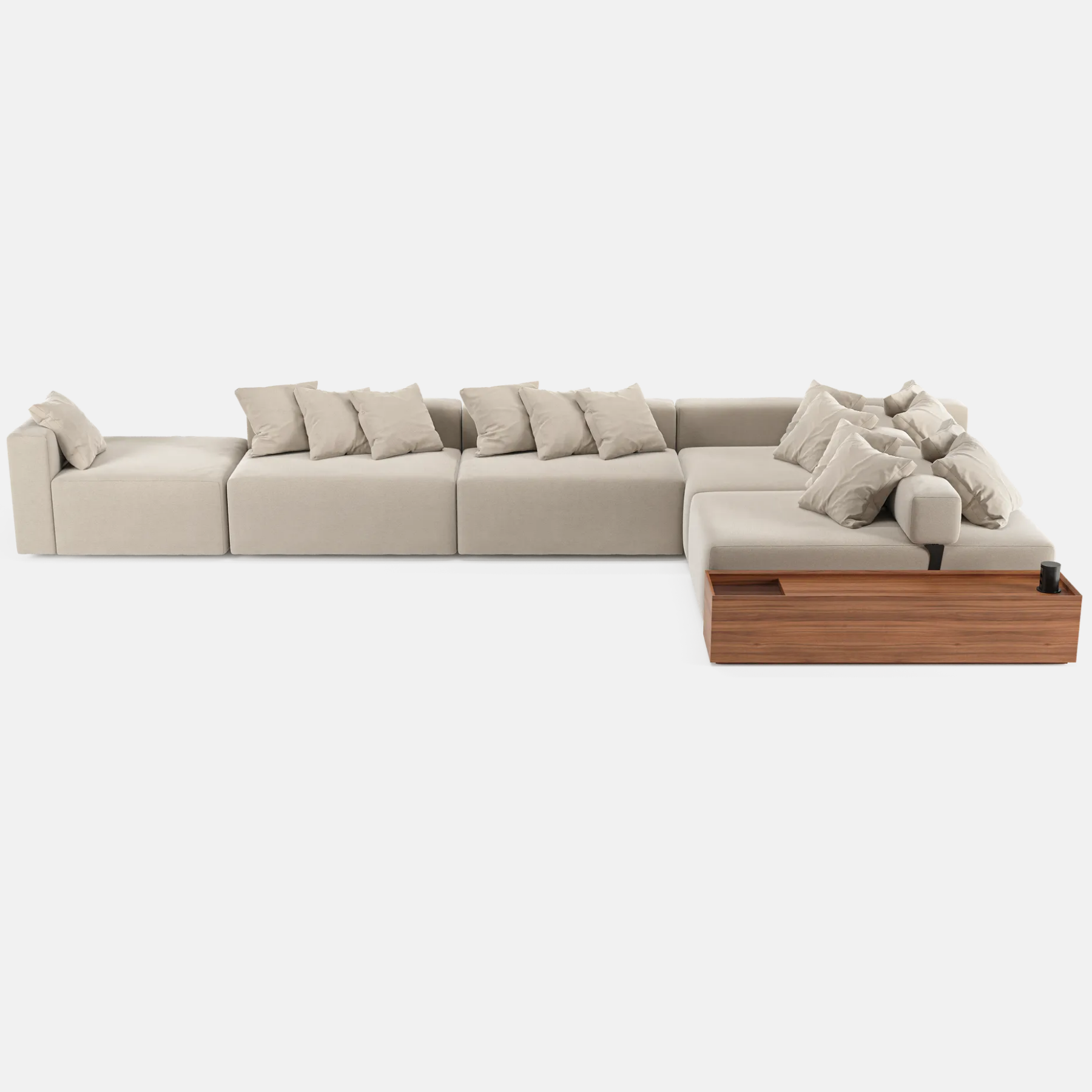 Myrtos nasce como uma paisagem habitável — um sistema de formas mutáveis onde conforto e engenho convergem. Seu nome evoca mitos antigos, mas seu propósito é absolutamente contemporâneo: reinventar o modo como vivemos o tempo dentro de casa. Módulos generosos desenham ilhas de acolhimento, enquanto encostos móveis, ajustáveis por sistema manual, motorizado e eletromagnético, permitem experiências sempre renovadas. Aqui, cada gesto, cada uso, é uma descoberta. A arquitetura do sofá se estende em elementos de madeira e couro soleta natural que incorporam elegância funcional: gaveta oculta, porta-acessórios discreto, superfícies de apoio em mármore com pontos de energia integrados, nicho para livros — onde a beleza e a utilidade coexistem com naturalidade. Myrtos é, assim, um convite a habitar o conforto em sua forma mais inteligente e sensível.